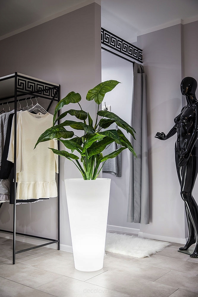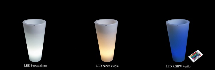 Każda donica podświetlana wyposażana jest opcjonalnie w jeden z trzech wariantów oświetlenia, których źródła światła stanowią energooszczędne żarówki LED z gwintem E27. Wariant LED RGBW posiada 16 kolorów. W zestawie również pilot, którym możemy ustawić wybrany kolor.