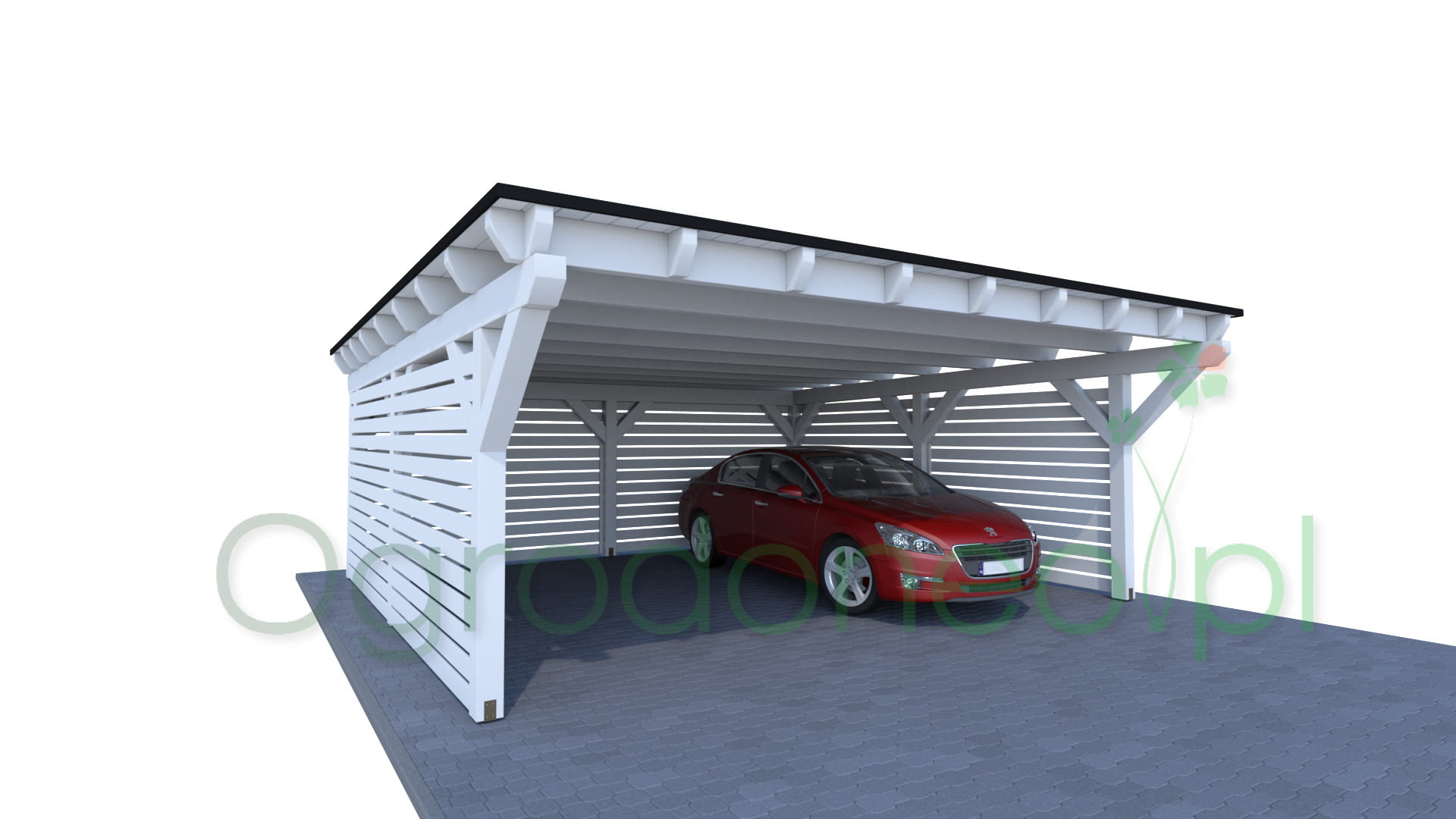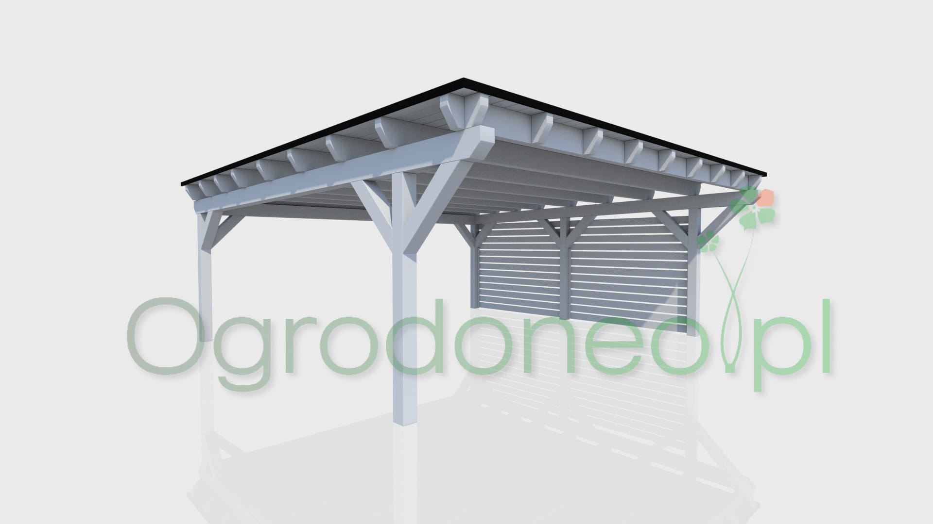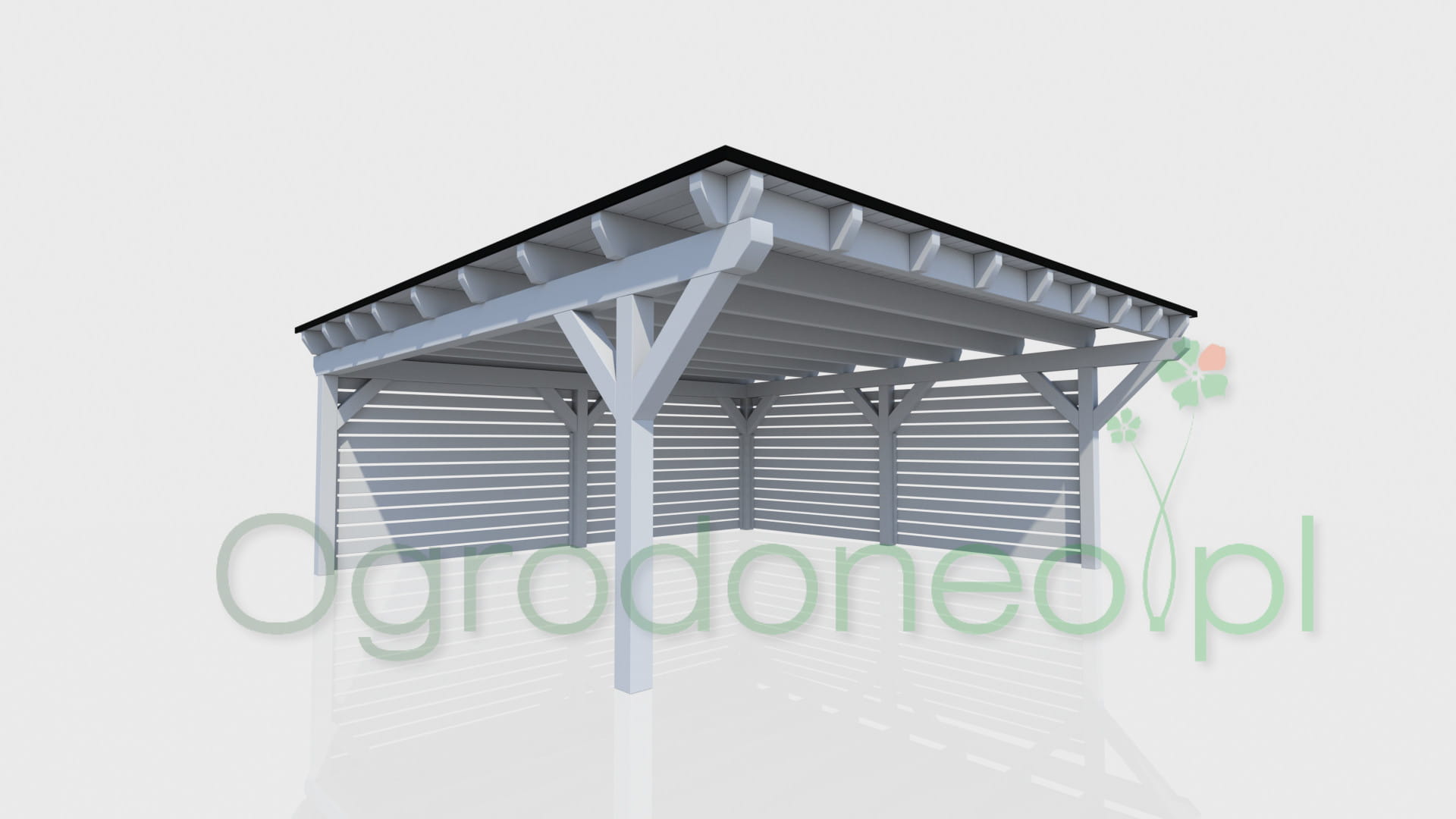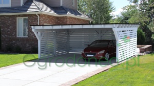 Alba to duża wiata garażowa na dwa auta, o wymiarze zadaszenia 610x600 cm - 36,6 m.kw. Konstrukcja w stylu nowoczesnym, dach jednospadowy. Dzięki zastosowaniu dużych przekrojów drewna (większych niż wynika to z wymogów wytrzymałości) wiata wygląda masywnie. Całość wykonana solidnie i z dbałością o szczegóły. Boki wiaty można dowolnie zabudować, dzięki czemu auta będą lepiej chronione od warunków atmosferycznych. Zabudowa pełni również rolę dekoracyjną.
