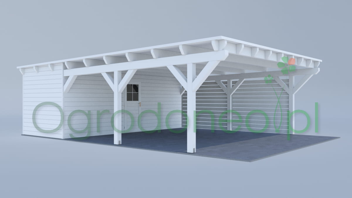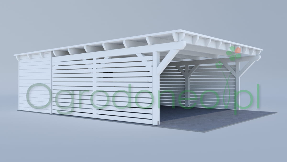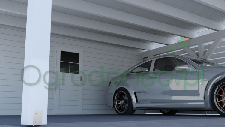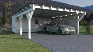 Alba MAX to duża wiata garażowa na dwa auta z pomieszczeniem gospodarczym. Rozstaw słupów wynosi 580x800 cm - 46,4 m.kw. (powierzchnia zabudowy). Pomieszczenie gospodarcze ma wymiar 580x300 cm (17,4 m.kw.). Powierzchnia zadaszenia części garażowej wynosi 610x900 cm - 54,9 m.kw. Konstrukcja w stylu nowoczesnym, dach jednospadowy. Dzięki zastosowaniu dużych przekrojów drewna (większych niż wynika to z wymogów wytrzymałości) wiata wygląda masywnie. Całość wykonana solidnie i z dbałością o szczegóły. Boki wiaty można dowolnie zabudować, dzięki czemu auta będą lepiej chronione od warunków atmosferycznych. Zabudowa pełni również rolę dekoracyjną.