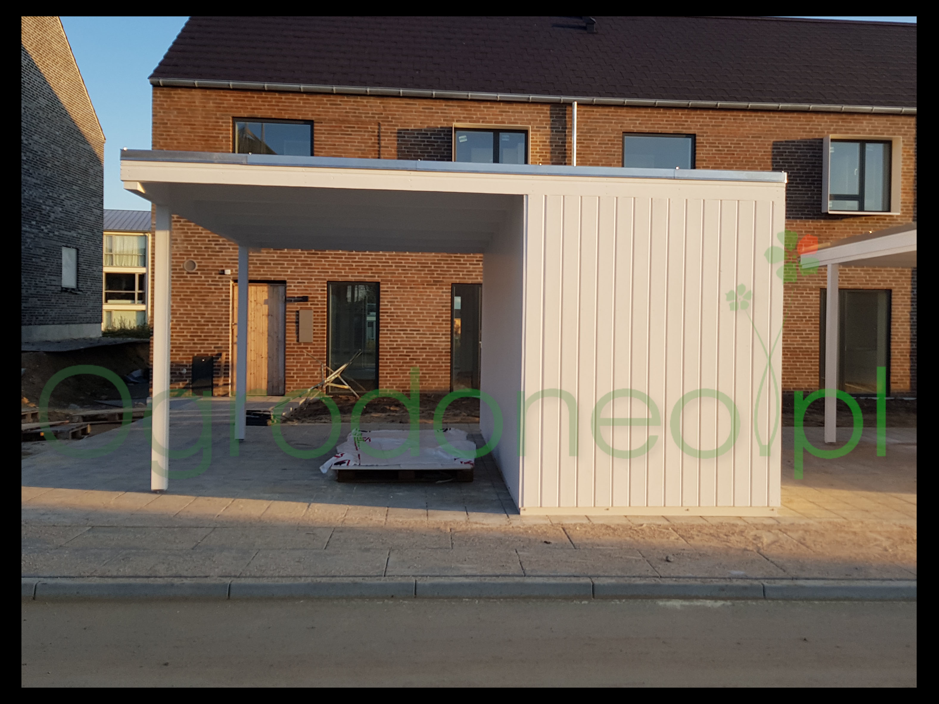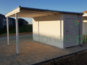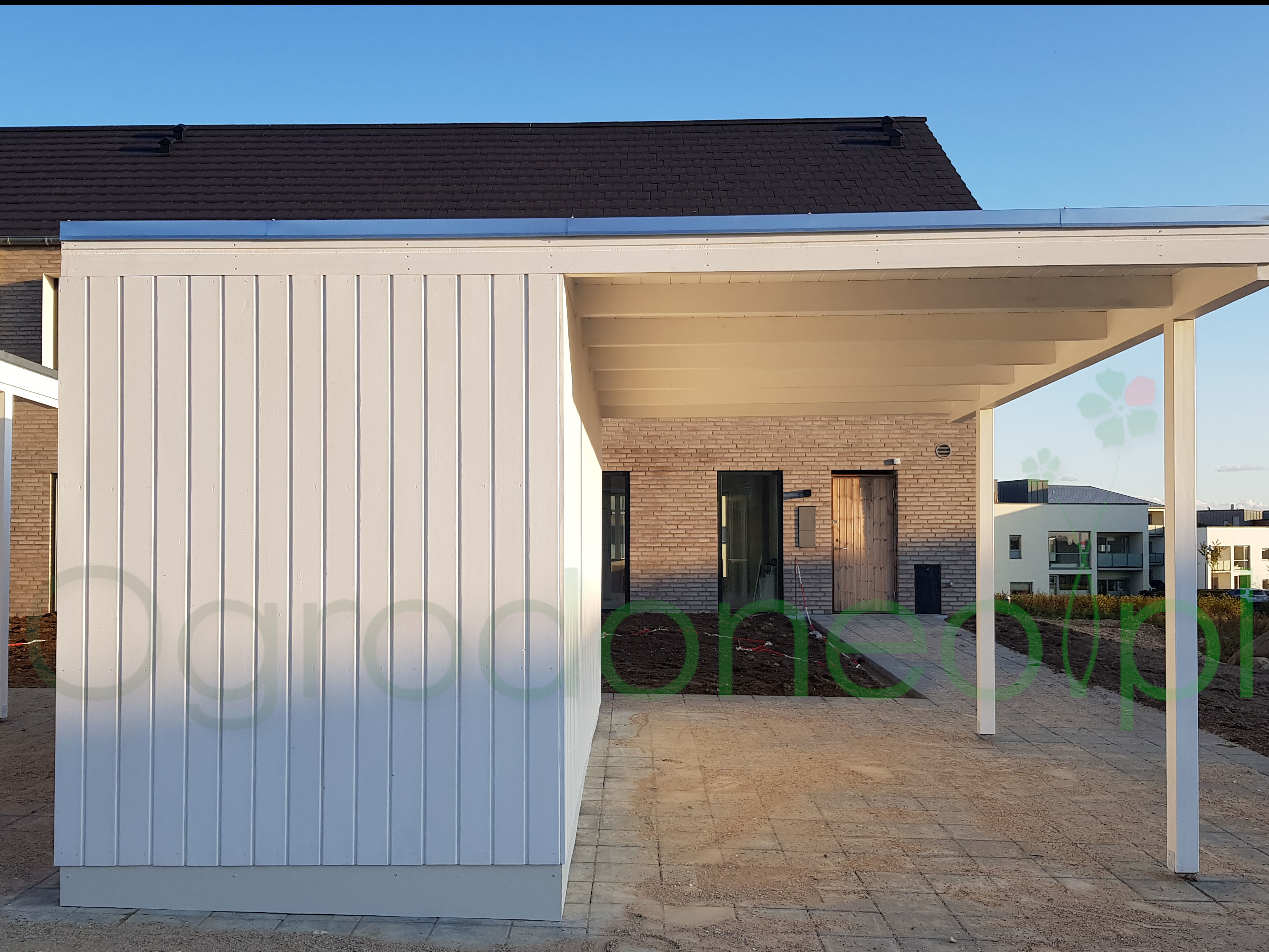 Aros to wiata garażowa na jedno auto z pomieszczeniem gospodarczym, o wymiarze zadaszenia 505x505 cm - 25,5 m.kw. Konstrukcja w stylu nowoczesnym, dach jednospadowy. Dzięki dodatkowemu pomieszczeniu zyskamy miejsce na przechowywanie akcesoriów ogrodowych! Całość wykonana solidnie i z dbałością o szczegóły.
